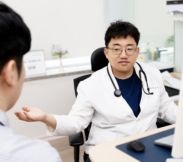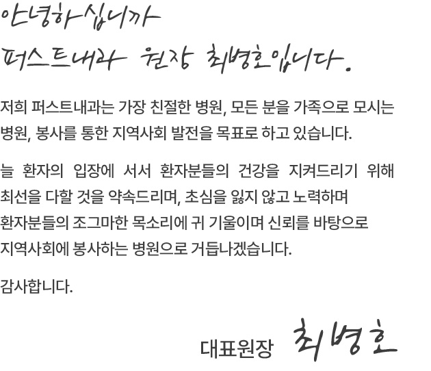 퍼스트내과는 전층 330평 규모를 사용하는 넓은 병원 시설로 내과클리닉, 건강검진센터, 내시경센터, 인공신장센터, 수액클리닉을 운영하고 있습니다.