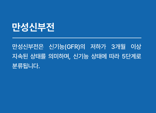 만성신부전의 치료는 각종 합병증을 예방하고 신부전 진행의 지연에 그 목표가 있습니다. 이를 위해 고나트륨 섭취와 단백질 식이를 제한해야 하며, 혈압을 130/80 이하로 엄격히 조절하는 것이 좋습니다. 또한 당뇨병성 만성신부전의 경우 적절한 혈당조절이 필요합니다. 그 외에도 감기약, 진통제 등 약물 및 한약, 건강식품 등의 섭취에도 주의가 필요합니다. 신기능의 지표인 사구체여과율이 15이하가 되거나 요독 증상이 심한 경우, 그리고 요독으로 인한 합병증이 발생한 경우에는 신대체요법(혈액투석, 복막투석, 신장이식)을 통한 전문적이고 체계적인 관리가 필요합니다.