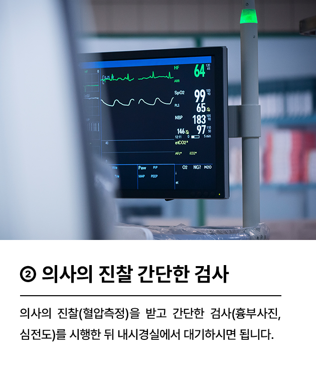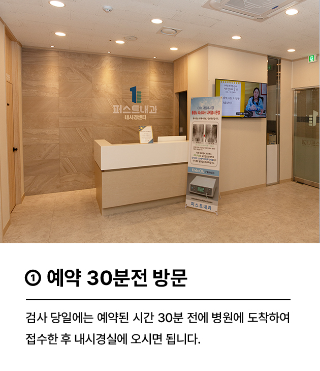 검사 당일에는 예약된 시간 30분 전에 병원에 도착하여 접수 후 내시경 검사실로 오세요. 연소자나 노약자는 보호자 동반 부탁드립니다.